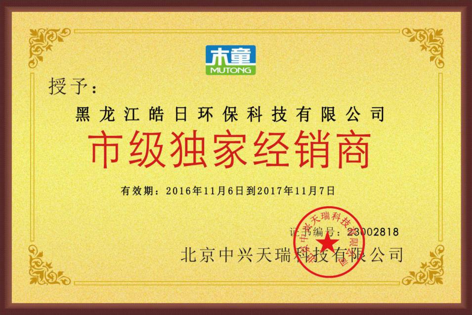 北京中興天瑞旗下木童除甲醛產(chǎn)品市級獨家經(jīng)銷商證書