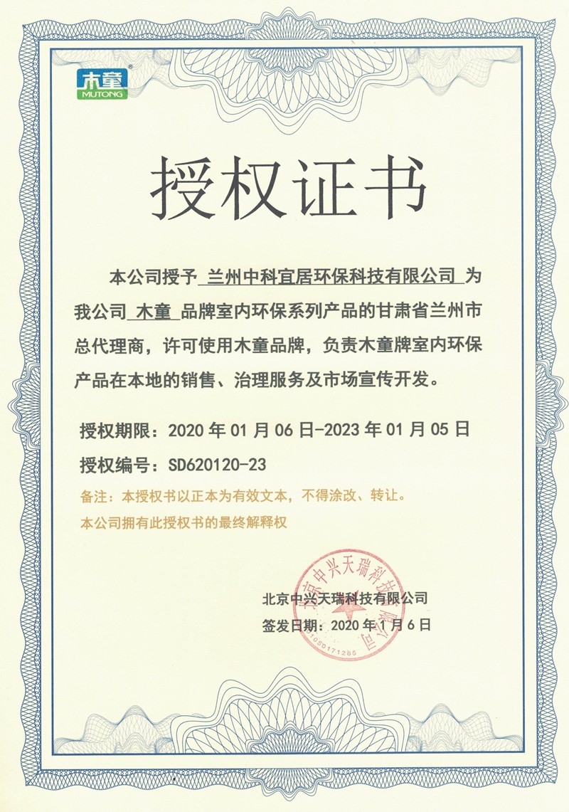 木童除甲醛蘭州代理商授權(quán)證書